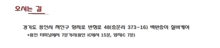 백만송이 실버케어경기도 용인시 처인구 양지면 반정로 48 (송문리373-16) 대표 : 정준영 고유번호 : 447-80-02010 전화 : 010-2226-3190